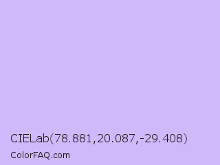 CIELab 78.881,20.087,-29.408 Color is a very light indigo color and the nearest color is Perfume #d0bef8. Hex code #ceb9fa and RGB value is rgb(206,185,250). In RGB color space, this color is composed of 81% red, 73% green, 98% blue, In CMYK color space, this color is composed of 18% cyan, 26% magenta, 0% yellow , 2% black , In HSL color space, this color has a hue angle of 259° , 87% saturation and 85% lightness.