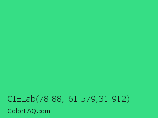 CIELab 78.88,-61.579,31.912 Color is a normal green color and the nearest color is UFO Green #3cd070. Hex code #36de85 and RGB value is rgb(54,222,133). In RGB color space, this color is composed of 21% red, 87% green, 52% blue, In CMYK color space, this color is composed of 76% cyan, 0% magenta, 40% yellow , 13% black , In HSL color space, this color has a hue angle of 148° , 72% saturation and 54% lightness.