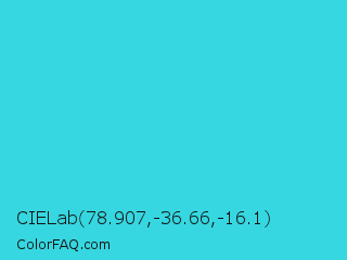 CIELab 78.907,-36.66,-16.1 Color is a normal cyan color and the nearest color is Turquoise #40e0d0. Hex code #36d7e0 and RGB value is rgb(54,215,224). In RGB color space, this color is composed of 21% red, 84% green, 88% blue, In CMYK color space, this color is composed of 76% cyan, 4% magenta, 0% yellow , 12% black , In HSL color space, this color has a hue angle of 183° , 73% saturation and 55% lightness.
