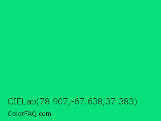 CIELab 78.907,-67.638,37.383 Color is a normal green color and the nearest color is Spring Green #00ff7f. Hex code #08e07a and RGB value is rgb(8,224,122). In RGB color space, this color is composed of 3% red, 88% green, 48% blue, In CMYK color space, this color is composed of 96% cyan, 0% magenta, 46% yellow , 12% black , In HSL color space, this color has a hue angle of 152° , 93% saturation and 45% lightness.