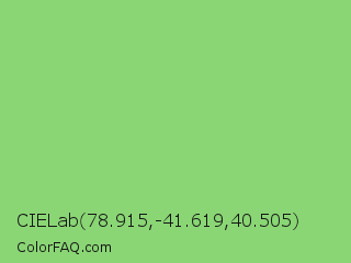 CIELab 78.915,-41.619,40.505 Color is a light green color and the nearest color is Pistachio #93c572. Hex code #8ad675 and RGB value is rgb(138,214,117). In RGB color space, this color is composed of 54% red, 84% green, 46% blue, In CMYK color space, this color is composed of 36% cyan, 0% magenta, 45% yellow , 16% black , In HSL color space, this color has a hue angle of 107° , 54% saturation and 65% lightness.