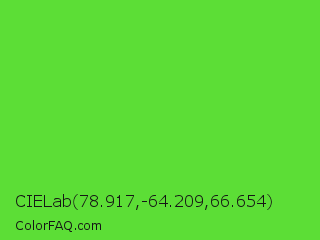 CIELab 78.917,-64.209,66.654 Color is a normal green color and the nearest color is Harlequin Green #46cb18. Hex code #5cde36 and RGB value is rgb(92,222,54). In RGB color space, this color is composed of 36% red, 87% green, 21% blue, In CMYK color space, this color is composed of 59% cyan, 0% magenta, 76% yellow , 13% black , In HSL color space, this color has a hue angle of 106° , 72% saturation and 54% lightness.