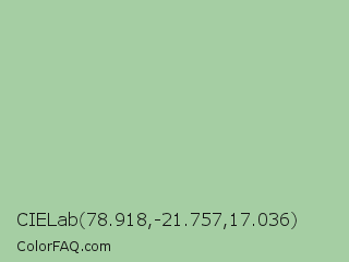 CIELab 78.918,-21.757,17.036 Color is a light green color and the nearest color is Spring Rain #accbb1. Hex code #a5cea3 and RGB value is rgb(165,206,163). In RGB color space, this color is composed of 65% red, 81% green, 64% blue, In CMYK color space, this color is composed of 20% cyan, 0% magenta, 21% yellow , 19% black , In HSL color space, this color has a hue angle of 117° , 30% saturation and 72% lightness.