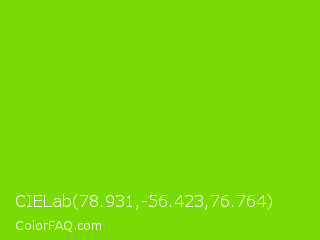 CIELab 78.931,-56.423,76.764 Color is a normal green color and the nearest color is Alien Armpit #84de02. Hex code #7adb04 and RGB value is rgb(122,219,4). In RGB color space, this color is composed of 48% red, 86% green, 2% blue, In CMYK color space, this color is composed of 44% cyan, 0% magenta, 98% yellow , 14% black , In HSL color space, this color has a hue angle of 87° , 96% saturation and 44% lightness.