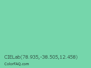CIELab 78.935,-38.505,12.458 Color is a light green color and the nearest color is Medium Aquamarine #66ddaa. Hex code #75d6ab and RGB value is rgb(117,214,171). In RGB color space, this color is composed of 46% red, 84% green, 67% blue, In CMYK color space, this color is composed of 45% cyan, 0% magenta, 20% yellow , 16% black , In HSL color space, this color has a hue angle of 153° , 54% saturation and 65% lightness.