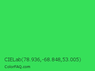CIELab 78.936,-68.848,53.005 Color is a normal green color and the nearest color is UFO Green #3cd070. Hex code #36e059 and RGB value is rgb(54,224,89). In RGB color space, this color is composed of 21% red, 88% green, 35% blue, In CMYK color space, this color is composed of 76% cyan, 0% magenta, 60% yellow , 12% black , In HSL color space, this color has a hue angle of 132° , 73% saturation and 55% lightness.