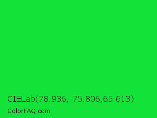 CIELab 78.936,-75.806,65.613 Color is a normal green color and the nearest color is Malachite #0bda51. Hex code #13e238 and RGB value is rgb(19,226,56). In RGB color space, this color is composed of 7% red, 89% green, 22% blue, In CMYK color space, this color is composed of 92% cyan, 0% magenta, 75% yellow , 11% black , In HSL color space, this color has a hue angle of 131° , 84% saturation and 48% lightness.