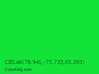 CIELab 78.941,-75.733,65.293 Color is a normal green color and the nearest color is Malachite #0bda51. Hex code #13e239 and RGB value is rgb(19,226,57). In RGB color space, this color is composed of 7% red, 89% green, 22% blue, In CMYK color space, this color is composed of 92% cyan, 0% magenta, 75% yellow , 11% black , In HSL color space, this color has a hue angle of 131° , 84% saturation and 48% lightness.