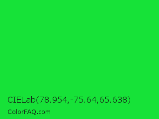 CIELab 78.954,-75.64,65.638 Color is a normal green color and the nearest color is Malachite #0bda51. Hex code #16e238 and RGB value is rgb(22,226,56). In RGB color space, this color is composed of 9% red, 89% green, 22% blue, In CMYK color space, this color is composed of 90% cyan, 0% magenta, 75% yellow , 11% black , In HSL color space, this color has a hue angle of 130° , 82% saturation and 49% lightness.