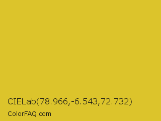 CIELab 78.966,-6.543,72.732 Color is a normal yellow color and the nearest color is Sunflower #e4d422. Hex code #dcc42b and RGB value is rgb(220,196,43). In RGB color space, this color is composed of 86% red, 77% green, 17% blue, In CMYK color space, this color is composed of 0% cyan, 11% magenta, 80% yellow , 14% black , In HSL color space, this color has a hue angle of 52° , 72% saturation and 52% lightness.