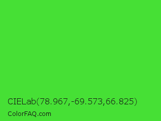 CIELab 78.967,-69.573,66.825 Color is a normal green color and the nearest color is Lime Green #32cd32. Hex code #46e035 and RGB value is rgb(70,224,53). In RGB color space, this color is composed of 27% red, 88% green, 21% blue, In CMYK color space, this color is composed of 69% cyan, 0% magenta, 76% yellow , 12% black , In HSL color space, this color has a hue angle of 114° , 73% saturation and 54% lightness.