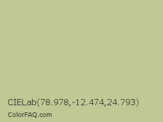 CIELab 78.978,-12.474,24.793 Color is a light lime color and the nearest color is Pine Glade #c7cd90. Hex code #bec995 and RGB value is rgb(190,201,149). In RGB color space, this color is composed of 75% red, 79% green, 58% blue, In CMYK color space, this color is composed of 5% cyan, 0% magenta, 26% yellow , 21% black , In HSL color space, this color has a hue angle of 73° , 33% saturation and 69% lightness.