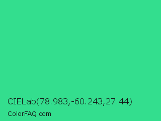 CIELab 78.983,-60.243,27.44 Color is a normal green color and the nearest color is Shamrock #33cc99. Hex code #33de8e and RGB value is rgb(51,222,142). In RGB color space, this color is composed of 20% red, 87% green, 56% blue, In CMYK color space, this color is composed of 77% cyan, 0% magenta, 36% yellow , 13% black , In HSL color space, this color has a hue angle of 152° , 72% saturation and 54% lightness.