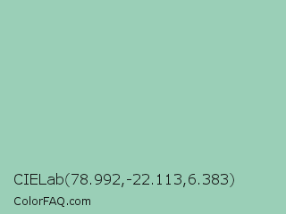 CIELab 78.992,-22.113,6.383 Color is a light green color and the nearest color is Turquoise Green #a0d6b4. Hex code #9acfb7 and RGB value is rgb(154,207,183). In RGB color space, this color is composed of 60% red, 81% green, 72% blue, In CMYK color space, this color is composed of 26% cyan, 0% magenta, 12% yellow , 19% black , In HSL color space, this color has a hue angle of 153° , 36% saturation and 71% lightness.