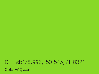 CIELab 78.993,-50.545,71.832 Color is a normal green color and the nearest color is Atlantis #97cd2d. Hex code #87d926 and RGB value is rgb(135,217,38). In RGB color space, this color is composed of 53% red, 85% green, 15% blue, In CMYK color space, this color is composed of 38% cyan, 0% magenta, 82% yellow , 15% black , In HSL color space, this color has a hue angle of 87° , 70% saturation and 50% lightness.