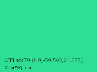 CIELab 79.019,-59.593,24.377 Color is a normal green color and the nearest color is Shamrock #33cc99. Hex code #2ede94 and RGB value is rgb(46,222,148). In RGB color space, this color is composed of 18% red, 87% green, 58% blue, In CMYK color space, this color is composed of 79% cyan, 0% magenta, 33% yellow , 13% black , In HSL color space, this color has a hue angle of 155° , 73% saturation and 53% lightness.