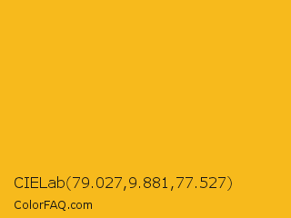 CIELab 79.027,9.881,77.527 Color is a normal orange color and the nearest color is Lightning Yellow #fcc01e. Hex code #f7ba1c and RGB value is rgb(247,186,28). In RGB color space, this color is composed of 97% red, 73% green, 11% blue, In CMYK color space, this color is composed of 0% cyan, 25% magenta, 89% yellow , 3% black , In HSL color space, this color has a hue angle of 43° , 93% saturation and 54% lightness.