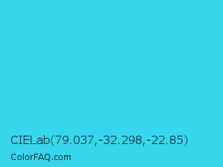 CIELab 79.037,-32.298,-22.85 Color is a normal cyan color and the nearest color is Turquoise #40e0d0. Hex code #36d6ed and RGB value is rgb(54,214,237). In RGB color space, this color is composed of 21% red, 84% green, 93% blue, In CMYK color space, this color is composed of 77% cyan, 10% magenta, 0% yellow , 7% black , In HSL color space, this color has a hue angle of 188° , 84% saturation and 57% lightness.