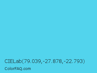 CIELab 79.039,-27.878,-22.793 Color is a light cyan color and the nearest color is Viking #64ccdb. Hex code #52d4ed and RGB value is rgb(82,212,237). In RGB color space, this color is composed of 32% red, 83% green, 93% blue, In CMYK color space, this color is composed of 65% cyan, 11% magenta, 0% yellow , 7% black , In HSL color space, this color has a hue angle of 190° , 81% saturation and 63% lightness.