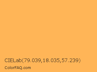 CIELab 79.039,18.035,57.239 Color is a light orange color and the nearest color is Texas Rose #ffb555. Hex code #ffb557 and RGB value is rgb(255,181,87). In RGB color space, this color is composed of 100% red, 71% green, 34% blue, In CMYK color space, this color is composed of 0% cyan, 29% magenta, 66% yellow , 0% black , In HSL color space, this color has a hue angle of 34° , 100% saturation and 67% lightness.