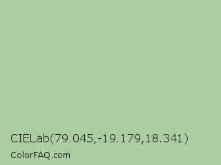 CIELab 79.045,-19.179,18.341 Color is a light green color and the nearest color is Spring Rain #accbb1. Hex code #accda1 and RGB value is rgb(172,205,161). In RGB color space, this color is composed of 67% red, 80% green, 63% blue, In CMYK color space, this color is composed of 16% cyan, 0% magenta, 21% yellow , 20% black , In HSL color space, this color has a hue angle of 105° , 31% saturation and 72% lightness.
