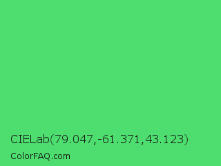 CIELab 79.047,-61.371,43.123 Color is a normal green color and the nearest color is UFO Green #3cd070. Hex code #4ede6f and RGB value is rgb(78,222,111). In RGB color space, this color is composed of 31% red, 87% green, 44% blue, In CMYK color space, this color is composed of 65% cyan, 0% magenta, 50% yellow , 13% black , In HSL color space, this color has a hue angle of 134° , 69% saturation and 59% lightness.