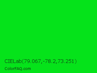 CIELab 79.067,-78.2,73.251 Color is a normal green color and the nearest color is Vivid Malachite #00cc33. Hex code #05e31a and RGB value is rgb(5,227,26). In RGB color space, this color is composed of 2% red, 89% green, 10% blue, In CMYK color space, this color is composed of 98% cyan, 0% magenta, 89% yellow , 11% black , In HSL color space, this color has a hue angle of 126° , 96% saturation and 45% lightness.