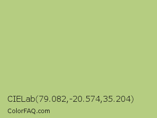 CIELab 79.082,-20.574,35.204 Color is a light lime color and the nearest color is Pine Glade #c7cd90. Hex code #b5cd81 and RGB value is rgb(181,205,129). In RGB color space, this color is composed of 71% red, 80% green, 51% blue, In CMYK color space, this color is composed of 12% cyan, 0% magenta, 37% yellow , 20% black , In HSL color space, this color has a hue angle of 79° , 43% saturation and 65% lightness.