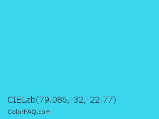 CIELab 79.086,-32,-22.77 Color is a normal cyan color and the nearest color is Turquoise #40e0d0. Hex code #39d6ed and RGB value is rgb(57,214,237). In RGB color space, this color is composed of 22% red, 84% green, 93% blue, In CMYK color space, this color is composed of 76% cyan, 10% magenta, 0% yellow , 7% black , In HSL color space, this color has a hue angle of 188° , 83% saturation and 58% lightness.