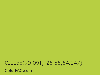 CIELab 79.091,-26.56,64.147 Color is a normal yellow color and the nearest color is Conifer #acdd4d. Hex code #b7cf42 and RGB value is rgb(183,207,66). In RGB color space, this color is composed of 72% red, 81% green, 26% blue, In CMYK color space, this color is composed of 12% cyan, 0% magenta, 68% yellow , 19% black , In HSL color space, this color has a hue angle of 70° , 59% saturation and 54% lightness.