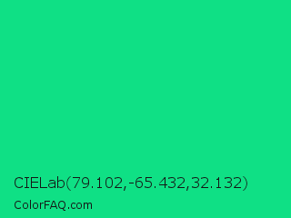 CIELab 79.102,-65.432,32.132 Color is a normal green color and the nearest color is Caribbean Green #00cc99. Hex code #0fe085 and RGB value is rgb(15,224,133). In RGB color space, this color is composed of 6% red, 88% green, 52% blue, In CMYK color space, this color is composed of 93% cyan, 0% magenta, 41% yellow , 12% black , In HSL color space, this color has a hue angle of 154° , 87% saturation and 47% lightness.