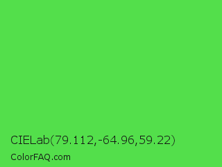 CIELab 79.112,-64.96,59.22 Color is a normal green color and the nearest color is Lime Green #32cd32. Hex code #53df4b and RGB value is rgb(83,223,75). In RGB color space, this color is composed of 33% red, 87% green, 29% blue, In CMYK color space, this color is composed of 63% cyan, 0% magenta, 66% yellow , 13% black , In HSL color space, this color has a hue angle of 117° , 70% saturation and 58% lightness.