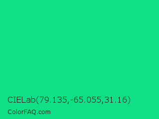 CIELab 79.135,-65.055,31.16 Color is a normal green color and the nearest color is Caribbean Green #00cc99. Hex code #0fe087 and RGB value is rgb(15,224,135). In RGB color space, this color is composed of 6% red, 88% green, 53% blue, In CMYK color space, this color is composed of 93% cyan, 0% magenta, 40% yellow , 12% black , In HSL color space, this color has a hue angle of 154° , 87% saturation and 47% lightness.