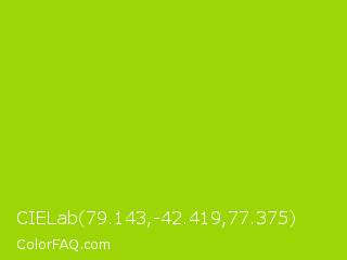 CIELab 79.143,-42.419,77.375 Color is a normal lime color and the nearest color is Vivid Lime Green #a6d608. Hex code #9cd607 and RGB value is rgb(156,214,7). In RGB color space, this color is composed of 61% red, 84% green, 3% blue, In CMYK color space, this color is composed of 27% cyan, 0% magenta, 97% yellow , 16% black , In HSL color space, this color has a hue angle of 77° , 94% saturation and 43% lightness.