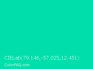 CIELab 79.146,-57.025,12.451 Color is a normal cyan color and the nearest color is Caribbean Green #00cc99. Hex code #00deab and RGB value is rgb(0,222,171). In RGB color space, this color is composed of 0% red, 87% green, 67% blue, In CMYK color space, this color is composed of 100% cyan, 0% magenta, 23% yellow , 13% black , In HSL color space, this color has a hue angle of 166° , 100% saturation and 44% lightness.