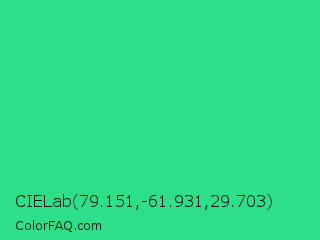 CIELab 79.151,-61.931,29.703 Color is a normal green color and the nearest color is Shamrock #33cc99. Hex code #2edf8a and RGB value is rgb(46,223,138). In RGB color space, this color is composed of 18% red, 87% green, 54% blue, In CMYK color space, this color is composed of 79% cyan, 0% magenta, 38% yellow , 13% black , In HSL color space, this color has a hue angle of 151° , 73% saturation and 53% lightness.