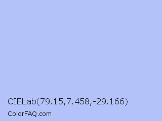 CIELab 79.15,7.458,-29.166 Color is a very light blue color and the nearest color is Perano #a9bef2. Hex code #b4c2fa and RGB value is rgb(180,194,250). In RGB color space, this color is composed of 71% red, 76% green, 98% blue, In CMYK color space, this color is composed of 28% cyan, 22% magenta, 0% yellow , 2% black , In HSL color space, this color has a hue angle of 228° , 88% saturation and 84% lightness.