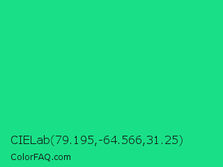 CIELab 79.195,-64.566,31.25 Color is a normal green color and the nearest color is Caribbean Green #00cc99. Hex code #19e087 and RGB value is rgb(25,224,135). In RGB color space, this color is composed of 10% red, 88% green, 53% blue, In CMYK color space, this color is composed of 89% cyan, 0% magenta, 40% yellow , 12% black , In HSL color space, this color has a hue angle of 153° , 80% saturation and 49% lightness.