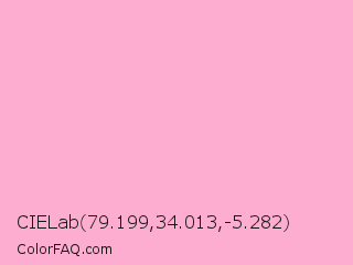 CIELab 79.199,34.013,-5.282 Color is a very light rose color and the nearest color is Lavender Pink #fbaed2. Hex code #fdadcf and RGB value is rgb(253,173,207). In RGB color space, this color is composed of 99% red, 68% green, 81% blue, In CMYK color space, this color is composed of 0% cyan, 32% magenta, 18% yellow , 1% black , In HSL color space, this color has a hue angle of 335° , 95% saturation and 84% lightness.