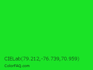 CIELab 79.212,-76.739,70.959 Color is a normal green color and the nearest color is Lime Green #32cd32. Hex code #1ae326 and RGB value is rgb(26,227,38). In RGB color space, this color is composed of 10% red, 89% green, 15% blue, In CMYK color space, this color is composed of 89% cyan, 0% magenta, 83% yellow , 11% black , In HSL color space, this color has a hue angle of 124° , 79% saturation and 50% lightness.