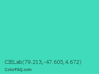 CIELab 79.213,-47.605,4.672 Color is a normal cyan color and the nearest color is Eucalyptus #44d7a8. Hex code #40dbba and RGB value is rgb(64,219,186). In RGB color space, this color is composed of 25% red, 86% green, 73% blue, In CMYK color space, this color is composed of 71% cyan, 0% magenta, 15% yellow , 14% black , In HSL color space, this color has a hue angle of 167° , 68% saturation and 55% lightness.