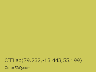 CIELab 79.232,-13.443,55.199 Color is a normal yellow color and the nearest color is Tacha #d6c562. Hex code #ccc959 and RGB value is rgb(204,201,89). In RGB color space, this color is composed of 80% red, 79% green, 35% blue, In CMYK color space, this color is composed of 0% cyan, 1% magenta, 56% yellow , 20% black , In HSL color space, this color has a hue angle of 58° , 53% saturation and 57% lightness.