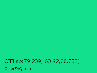 CIELab 79.239,-63.92,28.752 Color is a normal green color and the nearest color is Caribbean Green #00cc99. Hex code #13e08c and RGB value is rgb(19,224,140). In RGB color space, this color is composed of 7% red, 88% green, 55% blue, In CMYK color space, this color is composed of 92% cyan, 0% magenta, 38% yellow , 12% black , In HSL color space, this color has a hue angle of 155° , 84% saturation and 48% lightness.