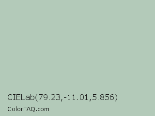 CIELab 79.23,-11.01,5.856 Color is a light green color and the nearest color is Spring Rain #accbb1. Hex code #b3cab9 and RGB value is rgb(179,202,185). In RGB color space, this color is composed of 70% red, 79% green, 73% blue, In CMYK color space, this color is composed of 11% cyan, 0% magenta, 8% yellow , 21% black , In HSL color space, this color has a hue angle of 136° , 18% saturation and 75% lightness.