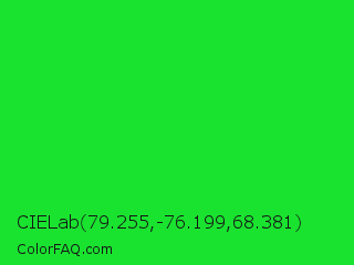 CIELab 79.255,-76.199,68.381 Color is a normal green color and the nearest color is Lime Green #32cd32. Hex code #1ae330 and RGB value is rgb(26,227,48). In RGB color space, this color is composed of 10% red, 89% green, 19% blue, In CMYK color space, this color is composed of 89% cyan, 0% magenta, 79% yellow , 11% black , In HSL color space, this color has a hue angle of 127° , 79% saturation and 50% lightness.