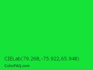 CIELab 79.268,-75.922,65.948 Color is a normal green color and the nearest color is Malachite #0bda51. Hex code #16e338 and RGB value is rgb(22,227,56). In RGB color space, this color is composed of 9% red, 89% green, 22% blue, In CMYK color space, this color is composed of 90% cyan, 0% magenta, 75% yellow , 11% black , In HSL color space, this color has a hue angle of 130° , 82% saturation and 49% lightness.