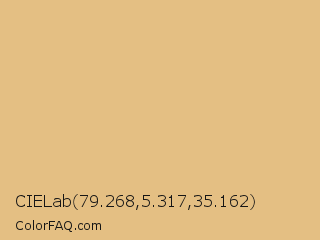 CIELab 79.268,5.317,35.162 Color is a light orange color and the nearest color is Gold Sand #e6be8a. Hex code #e4bf83 and RGB value is rgb(228,191,131). In RGB color space, this color is composed of 89% red, 75% green, 51% blue, In CMYK color space, this color is composed of 0% cyan, 16% magenta, 43% yellow , 11% black , In HSL color space, this color has a hue angle of 37° , 64% saturation and 70% lightness.