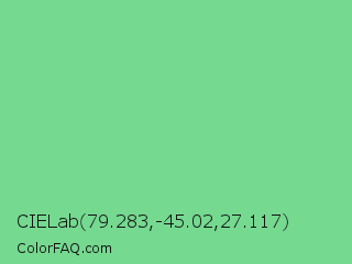 CIELab 79.283,-45.02,27.117 Color is a light green color and the nearest color is De York #7ac488. Hex code #75d990 and RGB value is rgb(117,217,144). In RGB color space, this color is composed of 46% red, 85% green, 56% blue, In CMYK color space, this color is composed of 46% cyan, 0% magenta, 34% yellow , 15% black , In HSL color space, this color has a hue angle of 136° , 57% saturation and 65% lightness.