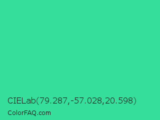 CIELab 79.287,-57.028,20.598 Color is a normal green color and the nearest color is Shamrock #33cc99. Hex code #36de9c and RGB value is rgb(54,222,156). In RGB color space, this color is composed of 21% red, 87% green, 61% blue, In CMYK color space, this color is composed of 76% cyan, 0% magenta, 30% yellow , 13% black , In HSL color space, this color has a hue angle of 156° , 72% saturation and 54% lightness.