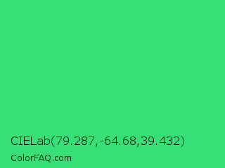 CIELab 79.287,-64.68,39.432 Color is a normal green color and the nearest color is UFO Green #3cd070. Hex code #36e077 and RGB value is rgb(54,224,119). In RGB color space, this color is composed of 21% red, 88% green, 47% blue, In CMYK color space, this color is composed of 76% cyan, 0% magenta, 47% yellow , 12% black , In HSL color space, this color has a hue angle of 143° , 73% saturation and 55% lightness.